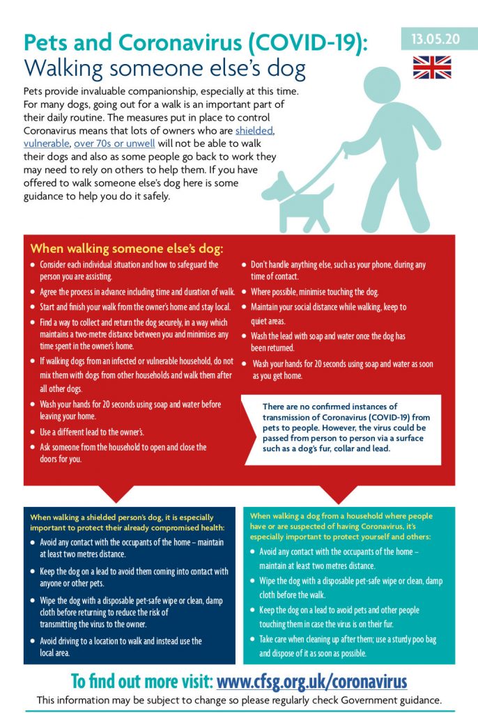 There remains no evidence that dogs are implicated in the transmission of Coronavirus to people and infection of dogs is unlikely, but that there is some risk of virus being carried by dogs on their fur and on their belongings.